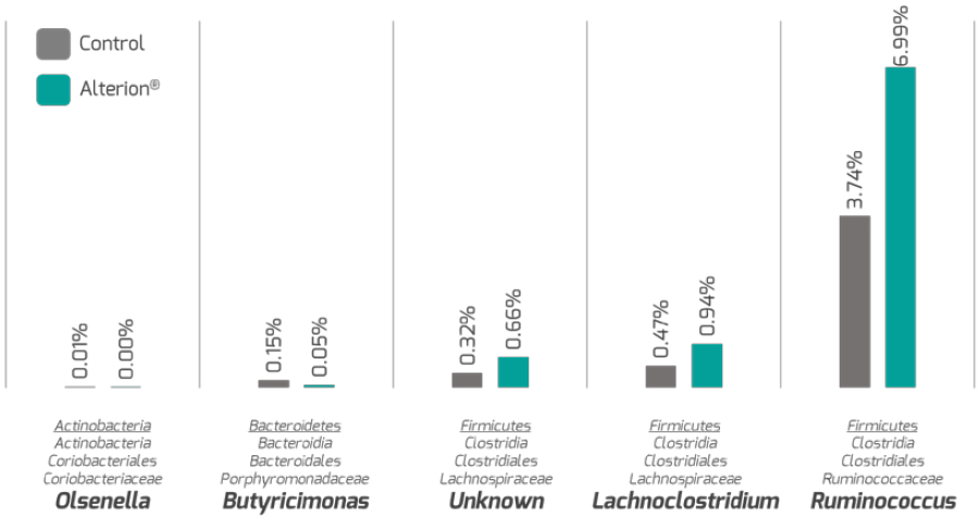 Further in a 42-day broiler trial at Southern Poultry Research, Inc (Athens, GA, USA) in collaboration with Dr Greg F. Mathis., at the cecal level (Figure 3), five genera (out of 116) were observed at a significantly higher relative abundance in Alterion® treatment group, mainly from the Firmicutes phylum including Ruminococcus. These bacteria are known to breakdown polysaccharides to oligosaccharides, assisting the digestion of cereals and vegetable proteins in poultry diets.