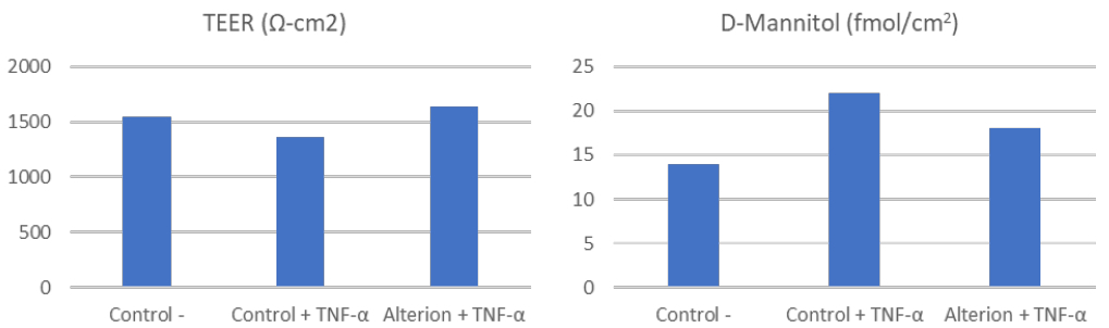 In the same study reported above, significantly longer intestinal microvilli (+18% increased length in the ileum and +17% in the cecum) was also observed in Alterion® fed group, suggesting its positive impact on gut morphology. In addition, direct influence of Alterion® on the intestinal barrier integrity was demonstrated by an in vitro model (Caco-2 monolayer cells in Transwell System) and trans-epithelial electrical resistance (TEER, voltage between the apical and basolateral side) measurements. The higher the TEER, the better the integrity. When a pro-inflammatory cytokine (TNF-α) was introduced, as expected, TEER decreased and D-Mannitol flux increased, suggesting the integrity of the barrier was compromised. Alterion® was able to restore both parameters to levels similar to non-stimulated cells (Figure 4). Further in vitro evidence explained the improvement in TEER by Alterion®, by the increased expression of tight junction proteins – ZO-1, claudin-1 and occluding (Rhayat et al., 2017).