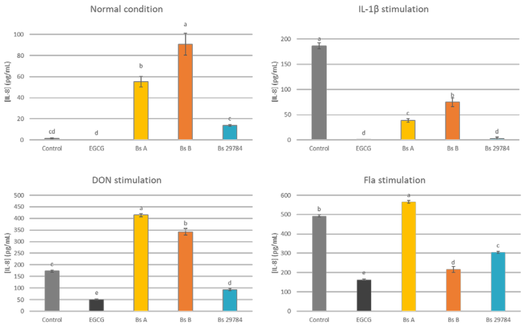 Interestingly, Bs A and Bs B exaggerated the effect of DON on IL-8 production, implying an even worse damage to the gut from DON. Whereas, Alterion® (Bs 29784) successfully reduced IL-8 production compared to DON-treated control and other inflammatory conditions (Figure 5). All these results further illustrated the uniqueness of Bacillus strain in Alterion®.
