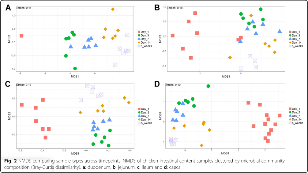 In this study we compared the bacterial microbiota of duodenal, jejunal, ileal and caecal samples of Ross 308 broilers at 5 timepoints: 1 day, 3 days, 7 days, 14 days and 5 weeks of age. Similar to the studies above, we found significant differences in the microbiota compositions of specific sample types with age and significant differences between sample types within timepoints.