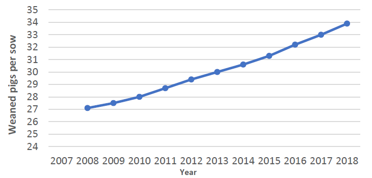 Over the last few decades, litter sizes and the number of weaned piglets per sow per year (PSY) have been improved considerably, especially driven by improved sow's prolificity via selection. With an increase of 0.2 piglets/year over the past 20 years, which we already observe in practice with large litters at birth (Quiniou, 2012), the PSY in the United States (23.2 to 25.0) and European Union (24.0 to 27.8) has increased considerably from 2008 to 2017 (PigCHAMP and AHDB-BPEX yearly report 2008-2017).