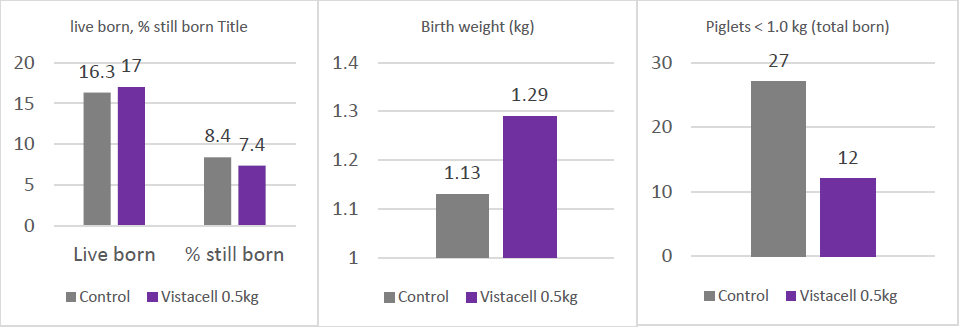 Graph 1, 2, 3: Effect of supplementing 0.5 kg of live yeast (Vistacell) on live born, % still born, birth weight and % of piglets with less than 1.0 kg live weight.