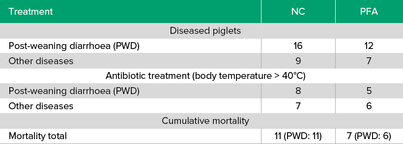 Phytogenic feed additives (PFA) are increasingly recognized for their potential to beneficially affect growth performance, nutrient digestibility and gut health in different livestock species, including piglets [1]. Therefore, the efficacy of a PFA on growth performance and health status of post-weaning piglets from d 25 to d 66 of age was tested compared to a control diet (NC) in a commercial pig breeding farm having a high incidence rate of post-weaning diarrhea (PWD) associated with pathogenic Escherichia coli.