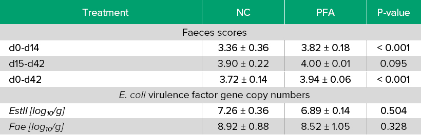 antibiotics. Based on pathological-morphological and clinical diagnostic findings the mortality in both treatments was mainly due to PWD caused by toxin-producing E. coli. Antibiotic treatments against PWD (-37.5%) and mortality rate (-36.4%) were reduced in the PFA group compared to the NC (Table 1). In addition, feces scores were improved (P<0.001) in the PFA group during d0-14 and d0-42 compared to the NC (Table 2). Although not significantly, qPCR analysis of E. coli virulence factors fae and estII showed a numeric reduction of gene copy numbers in the PFA group compared to the NC (Table 2).