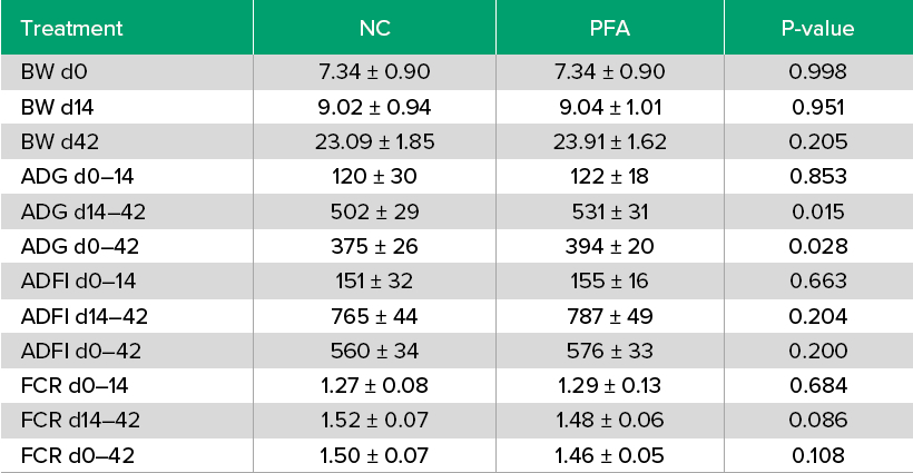 Growth performance was not affected by treatments during the first 14 days of the study. Between d14 and d42, however the PFA group had an increased ADG (P=0.015) and showed a tendency for improved FCR (P=0.86; Table 3), resulting in an increase of ADG by 5.1% (P=0.028) for the whole trial period compared to the NC (Figure 1). In summary, economical benefits by feeding the PFA, even under health challenging conditions, are basing on improved piglet performance due to an
