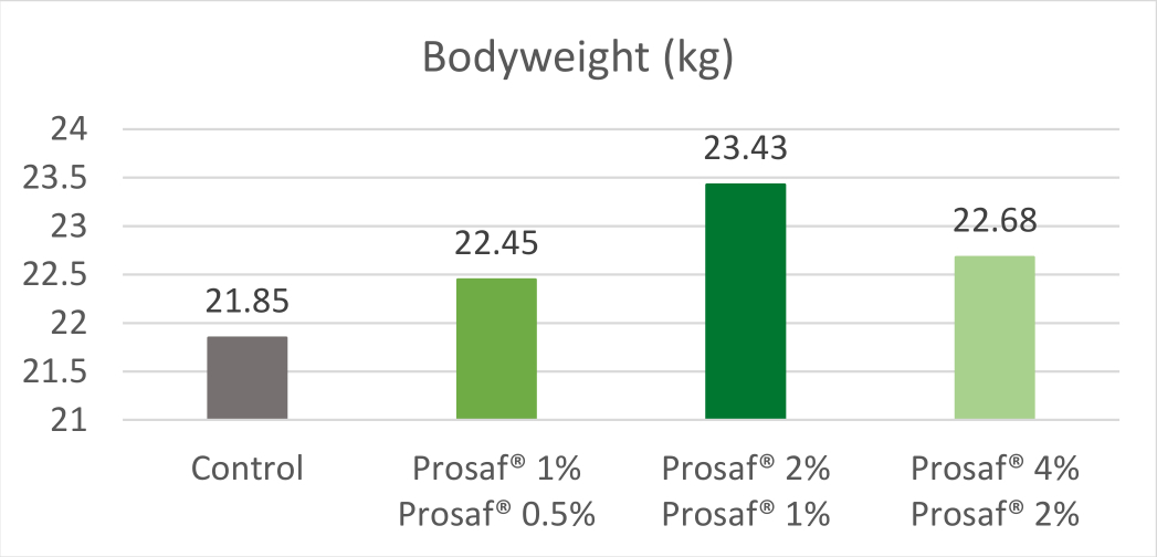 Figure 2. Inclusion of 2% Prosaf® in pre-starter followed by 1% Prosaf® in the second diet resulted in the highest performance.