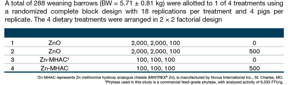 For these reasons researchers at Novus International, Inc. (Saint Charles, Missouri, U.S.A.) investigated if lower levels of organic trace minerals provided as MINTREX® Zn (Zn-MHAC), thanks to superior bioavailability, do not produce the same environmental impact as its inorganic counterpart zinc oxide, thus, serving as an appropriate surrogate.