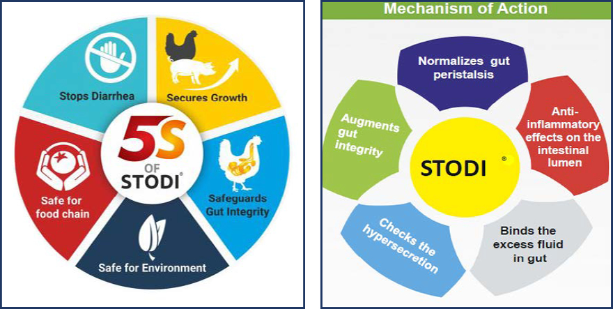 The pressure on farm animals to "produce more from less" is ever increasing. Advances in feed formulation and farm management have made it feasible to lower the FCR in broilers and increase egg production in layers. This feasibility, however, is challenged by variations in weather conditions and fluctuating feed quality. These make the bird susceptible to pathogenic microbes which proliferate in the gut and lead to diarrhoea.
