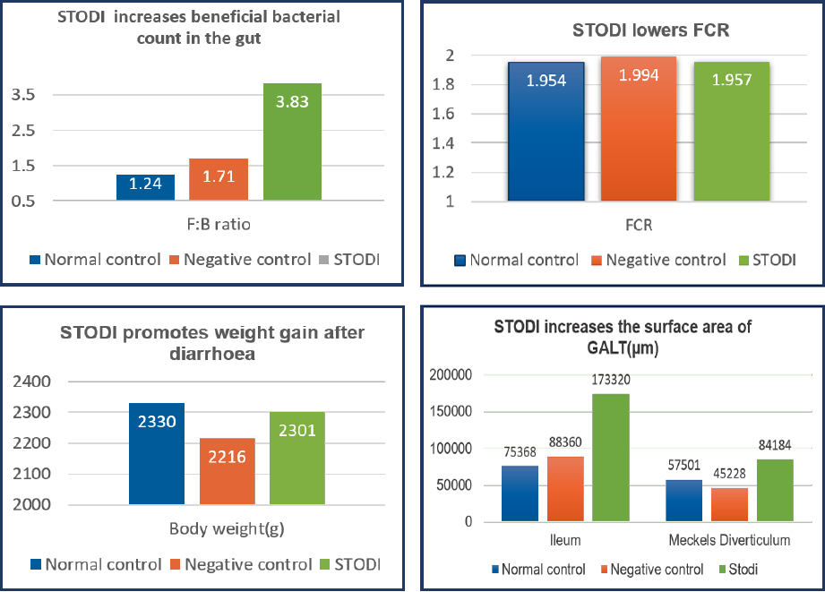 Marimuthu et al., (2019) confirmed that Stodi® was beneficial in increasing the F:B ratio in broilers , a key indicator of superior gut health, by metagenomically evaluating the gut microbe phyla Firmicutes against Bacteroidetes. This increase in beneficial bacterial count lead to an increase in body weight gain and a decrease in FCR, as compared to the diarrhoeal control. It is very likely that the potency of NR-SBP's like Stodi®, containing an effective, standardised quantity of phytoactives are responsible for this improvement in performance parameters.