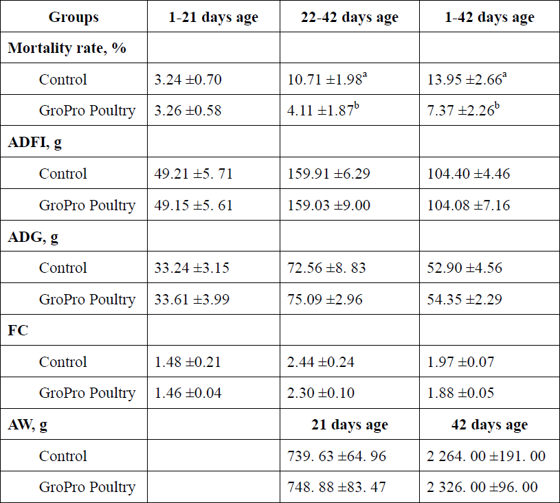 From Table 1, it can be seen that the mortality and feed-meat ratio of GroPro Poultry group were lower than those of control group, and the mortality of two groups showed significant difference after 21 days of age (P < 0.05); ADG and body mass of the group were higher than those of the control group, and the daily intake of food was close to that of the control group. Therefore, the addition of GroPro Poultry in the diet can improve feed conversion rate, feed quality and survival rate in later period.