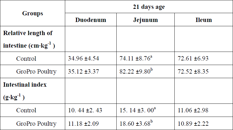 From Table 2, it can be seen that the jejunal index and relative length of GroPro Poultry group were significantly increased compared with those of the control group (P < 0.05).