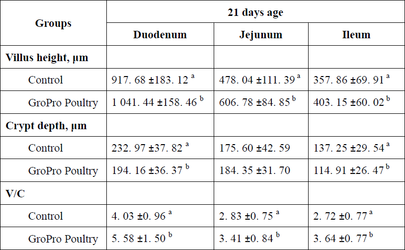 Table 3. Effects of GroPro Poultry on intestinal morphology in broilers