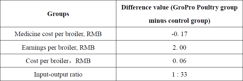 Adding GroPro Poultry to the diet can promote the development of small intestine, improve the intestinal morphology and structure, enhance the digestive and absorption function of small intestine, and then improve the feed conversion rate, reduce the feed-meat ratio by 0.09, and improve the quality of entry by 60g. Adding GroPro Poultry to the diet can promote the development of bursa of Fabricius and facilitate the development and maturation of B lymphocyte. Adding GroPro Poultry to the diet could increase the slaughter rate by 0.55%. Adding 800 mg/kg GroPro Poultry to the diet, for each chicken, an average investment of 0.06 RMB during the whole breeding process can reduce the cost of medicine by 0.17 RMB, and increase the profit by 2 RMB when it finally comes out.