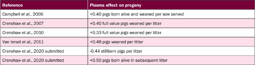 Performance enhancements so far seen through the supplementation of SDPP at 0.5-1.0% in sow feed during this period have demonstrated reductions in the occurrence of stillbirths as well as increases in the subsequent litter size for young sows resulting in a reduction of the common commercial phenomenon of the second parity syndrome. Whilst our understanding of the mode of action remains incomplete there is evidence to demonstrate a reduction in inflammation in both sows and her progeny in the week after farrowing. This outcome implies there may be systemic benefits passed from the sow to her progeny when feeding plasma to sows during gestation.