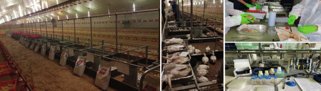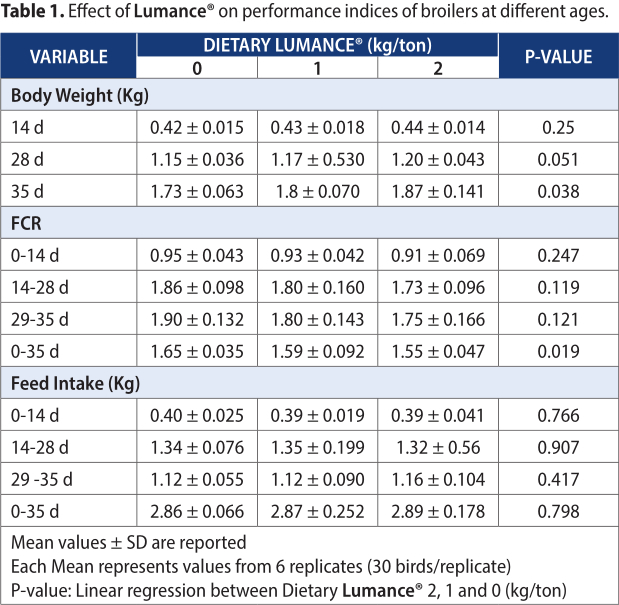 The experiment is a completely randomized design of treatments with Lumance® at three different concentrations (0, 1, and 2 kg/ton) in the feed. Growth parameters were determined during the experiment and the anti-inflammatory effect of the dietary treatments was measured by the jejunal level of the proinflammatory cytokine (Interferon-gamma (IFNγ)), and as well as that of Malonylaldehyde (MDA) on day 28. A total of 540 male broiler chickens (Ross 308), aged 1d old, of similar mean body weight (BW; 46·5 (SEM 0·01g), vaccinated for Newcastle disease, were obtained from a commercial hatchery (Vervaeke Belavi, Belgium). The chicks were housed in pens of 1·2 m2 and raised on wood shavings at an experimental set-up inside a commercial farm (Figure 1). The experiment was carried out in 18 pens with 30 broilers per pen, and 6 pens per treatment. For each pen, one broiler was randomly chosen, and samples of mid-jejunum were taken on day 28 for the determination and measuring the biomarkers of inflammation. Commercial starter, grower and finisher diets were offered to the broilers from 1 to 14 d of age and 15 to 28 d and from 28 to 35 d of age, respectively. All feeds were mash wheat-rye based diet without coccidiostat, NSP enzymes, and anti-cocci vaccination (Starter: 60% wheat; Grower & Finisher: 60% wheat + 5% rye). Feed and water were provided ad libitum throughout the experiment.Growth parameters