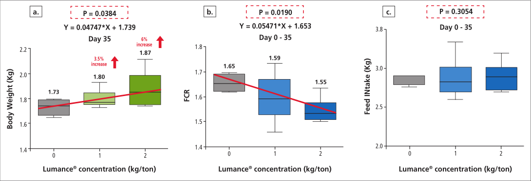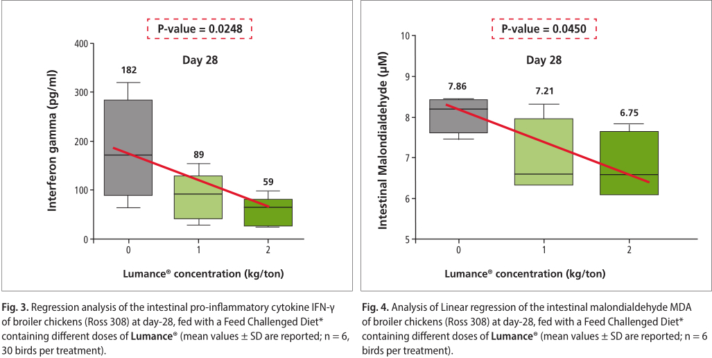 IIt is well established that stress, regardless of its origin or nature (biological, environmental, nutritional, physical, or chemical) leads to inflammation and the release of pro-inflammatory cytokines (Baxter et al 2019, Hermans et al 2012). Cytokines activate immune cells and have a profound detrimental effect on growth performance (Niewold, 2007). It was shown that broilers consuming wheat and rye-based diet for 20 days increased the systemic level of pro-inflammatory cytokine (IFNγ) which contributed to an increase in inflammation (Chen, et al 2015). Non-starch polysaccharides, together with resistant starch and lignin, that form the whole of dietary fiber of wheat and rye, have been reported to exhibit multiple biological functions that can induce intestinal chronic inflammation (Nie et al, 2017). Several mechanisms of action of NSPs on nutrient absorption and inflammation have been described that include an increased digesta viscosity, thickening of the mucous layer on the intestinal mucosa, epithelial cell apoptosis (Teirlynck et al, 2009), and the nutritional and economic consequences of mounting an inflammatory response in poultry are inversely related to bodyweight gain and overall performance (Tellez et al 2005 ). In our study, a high amount of wheat and rye with no coccidiostats and cocci vaccine were used in all experimental diets as an in-vivo model of chronic inflammation.The effects of the three dietary treatments (Lumance® 0, 1, 2 kg per ton) BW, FI, and FCR are summarized in Table 1. Overall, Lumance® enhanced BW significantly in a linear manner at 35d (P = 0038). Supplementation of Lumance® with 1 and 2 kg/ton increased the bodyweight of broilers by 3.6 % and 6 % respectively, compared to the control (Figure 2a). Concerning the feed conversion ratio, over 0–5 weeks, Lumance®-fed chicks significantly improved the FCR in a linear manner (P = 0019) (Figure 2 b). Regarding the feed intake, no differences were observed between the treatments over the 5 weeks (P = 0.305) (Figure 2c). Mortality was not significantly (P > 0·05) associated with treatment but was mostly associated with the typical symptoms of coccidiosis. Several in-vitro and in-vivo studies have identified the anti-inflammatory effects of fatty acids and polyphenols. The intestinal concentration of the pro-inflammatory cytokine Interferon-gamma (IFNγ), was significantly affected by the dietary treatments.