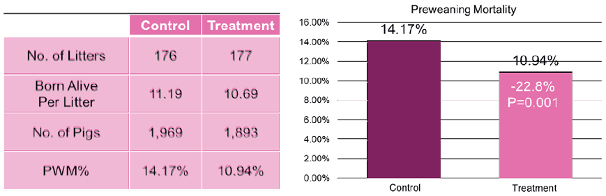 The overall results of this investigation, which analysed data collected from 3862 piglets, demonstrated how feeding the isotonic drink alongside a creep diet from days 2 to 8 of life and around weaning helped to reduce pre-weaning mortality by more than 22% (Figure 1) and improve productivity in the nursery stage and beyond. The findings were in line with 36 other trials across Europe, Asia and the USA, involving 64,148 piglets in total, and showing an average reduction of 23.6% (P<0.0001), in pre-weaning mortality vs. controls (10.6% vs. 13.9%). This equates to +0.5 pigs per litter or +1.2 piglets per sow per year.