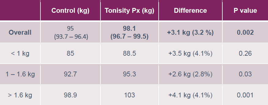Table 1: Effect on Tonisity Px on pre-harvest weights, overall, and per class of weight at birth