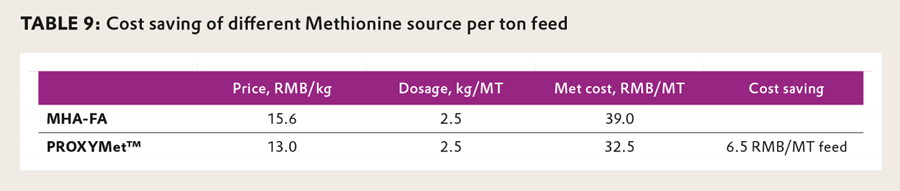 Besides comparable animal performance, the financial savings are significant when replacing MHA products with MetAMINO in the 100:65 ratio in commercial feed. Several large scale trials prove it: