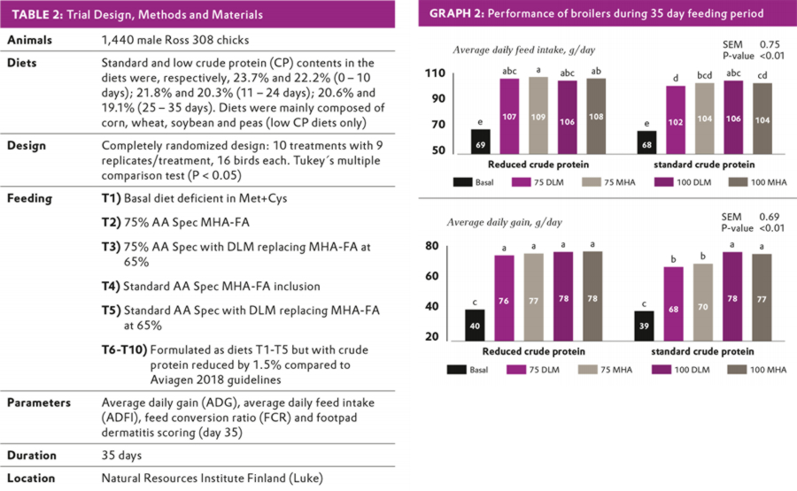 It can be concluded that replacing 100 parts of MHA products with 65 part of DL-methionine yields similar broiler growth performance and processing parameters, independent of the dietary Met+Cys and protein levels.