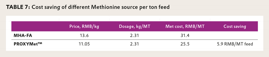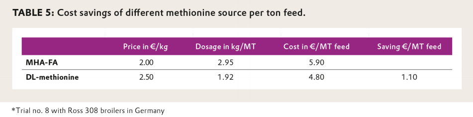 During the trial, it was found that for every metric ton of feed, 2.95/kg of liquid MHA-FA or only 1.92/kg of DL-methionine per metric ton of feed was required, averaged over feeding phases. Assuming a price of € 2.50/kg DLM and €2.00/kg MHA-FA, using DLM saves €1.10 per metric ton of feed (Table 2). This equals an amount of over €10,000 per year for this farm.