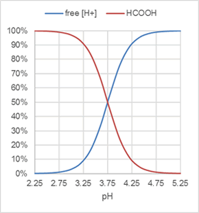 For example, HCl has a pKa of -7. The pKa of an acid is the pH at which the acid will be half dissociated. Since a negative pH is only theoretical, under any practical situation HCl will convert entirely to H+ and Cl– in water, regardless of the pH of that water. However, formic acid has a pKa of 3.75, which means that the dissociated (H+ + HCOO–) and undissociated states (HCOOH) will both exist in equilibrium determined by the pH of the solution. For example, at pH 3.75 the dissociated and undissociated states will both exist in 50:50 equilibrium, at pH 3.25 the equilibrium will be 10:90, and at pH 4.25 it will be 90:10. This pH dependent equilibrium is important, because it enhances the efficacy of organic acids relative to inorganic acids despite the latter's greater strength.