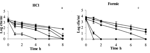 This was illustrated quite nicely in a trial by Chaveerach et al. (2002) in which they inoculated animal feed with 4 different strains of Campylobacter, and then acidified the diets to various pH's using different acids. They reported that at a pH of 4.0 and 4.5, Campylobacter recoveries from feed dropped to zero in about 4 and 8 hours, respectively, when the pH was attained using HCl (Figure 3). However, when they used formic acid to acidify the feed to pH 4.0 and 4.5, it only took 1 and 2 hours, respectively. The ability to stress the intracellular environment of the Campylobacter increased the cytotoxicity by a factor of 4.