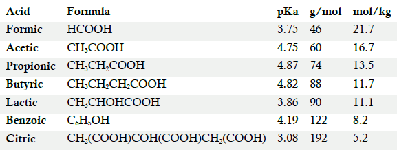 However, different molecules have different weights and densities. As you can see in the table below (Table 1), formic acid is the simplest of the organic acids, with the R-group consisting of a single hydrogen atom, and as a result has the lowest molecular mass (46 g/mol) and greatest molecular density of any organic acid (21.7 mol/kg). Unlike chemists, we formulate our diets based on the weight of the ingredients, not their molarity. Therefore, there are benefits to higher acid density in the form of greater concentration of active ingredient within the same formulation space in the mixer.