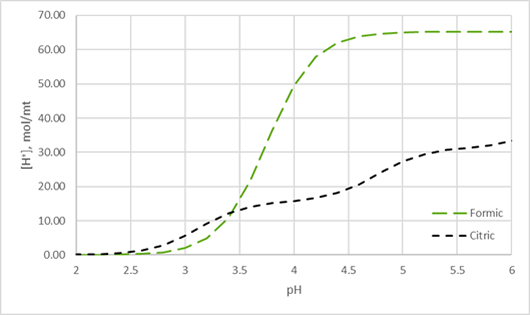 Figure 4. Free [H+] from formic and citric acid when added to feed at 3 kg/mt