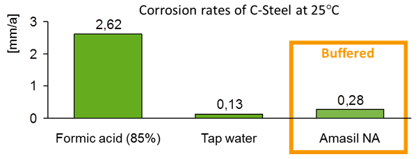 The main reasons to use acid salts are to facilitate handling and to reduce corrosion. Pure acid salts are generally dry powders, which can be more convenient than liquid acids depending on your mill, and they are less corrosive. For example, by converting part of the formic acid in Amasil NA to sodium formate and thereby reducing the free formic acid concentration to 61%, we can cut the corrosion rate on carbon steel by a factor of 10× (Figure 5). However, that benefit comes with a cost of slightly reduced potency, which is why our recommendations for Amasil NA are slightly higher than for Amasil 85.