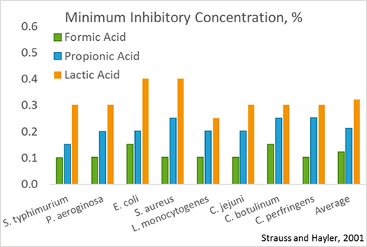 Figure 6. Minimum concentration of organic acids to inhibit the growth of bacteria commonly found on feed.