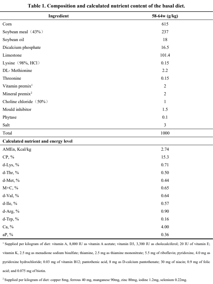 A total of 480 Hy-line variety brown (58-weekold) were randomly assigned to 5 dietary treatments, with 12 replicates of 8 hens. The control group (CON) received a standard corn/soybean meal basal diet (Table 1), formulated according to the requirement of Hy-line laying hens. The treatment groups were fed the basal diet that containing vitamin C (including vitamin C phosphate and coated vitamin C). After 2 weeks of adaptive feeding, the laying period lasted 6 weeks. Both vitamin C phosphate and coated vitamin C are provided by Zhejiang NHU Company Ltd. The content of vitamin C phosphate is 35 percent and the content of coated vitamin C is 97 percent.