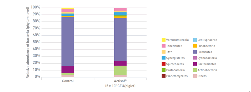 The modification of the gut microbiota illustrated below (Figure 5) as a result of Actisaf® supplementation also has a role in maintaining gut health and improving piglet immunity and performance. Phylum Actinobacteria, which includes beneficial bacteria such as Bifidobacterium and Collinsella, was enriched by Actisaf® supplementation while phylum Bacteroidetes, including some potentially harmful bacteria, was present at lower levels in the Actisaf®-supplemented group than the Control group.