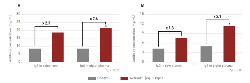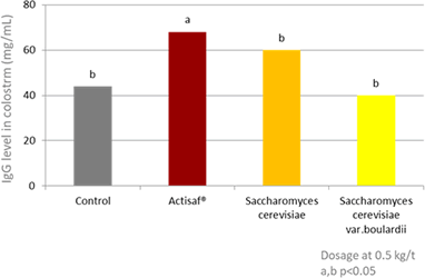 Piglet gut health management starts immediately after birth by managing the sow's diet and health during the late gestation and early lactation periods. Indeed, the piglet is immunodeficient at birth, and is highly dependent upon the supply of both specific and non-specific immune factors in maternal colostrum and milk for immune protection, development and survival. Immunoglobulin G (IgG) is the most important globulin in the first weeks of life, and IgG from colostrum is absorbed through the gastrointestinal tract during the first 24 to 48 hours postpartum. Figure 2 shows that supplementing gestating and lactating sows with Actisaf® ,a concentrate of live yeast Saccharomyces cerevisiae Sc 47 proprietary strain, improves milk quality by increasing the concentration of IgG in the sow's colostrum, and this is passed on to the piglets (Jang et al., 2013).