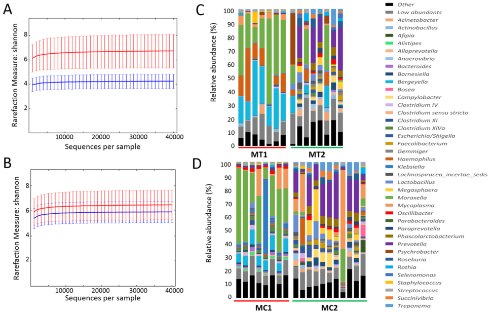 Figure 1. Nasal microbiota of piglets from farms MT and MC before (1) and after (2) antimicrobial treatment removal. Microbiota rarefaction curve generated using Shannon diversity estimator with samples from farms MT (A) and MC (B). Samples have been rarefied at an even depth of 40,000 sequences per sample. Error bars indicate the 95% confidence intervals. The mean relative abundance (%) of OTUs found in nasal swabs of piglets from farms MT (C) and MC (D) is presented at genera level.