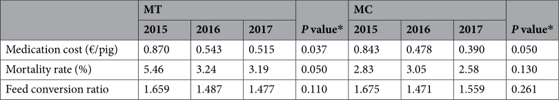 Table 3. Production data collected from the nursery phases of MT and MC farms in three consecutive years. *P values were estimated through Krukal-Wallis non-parametric test.