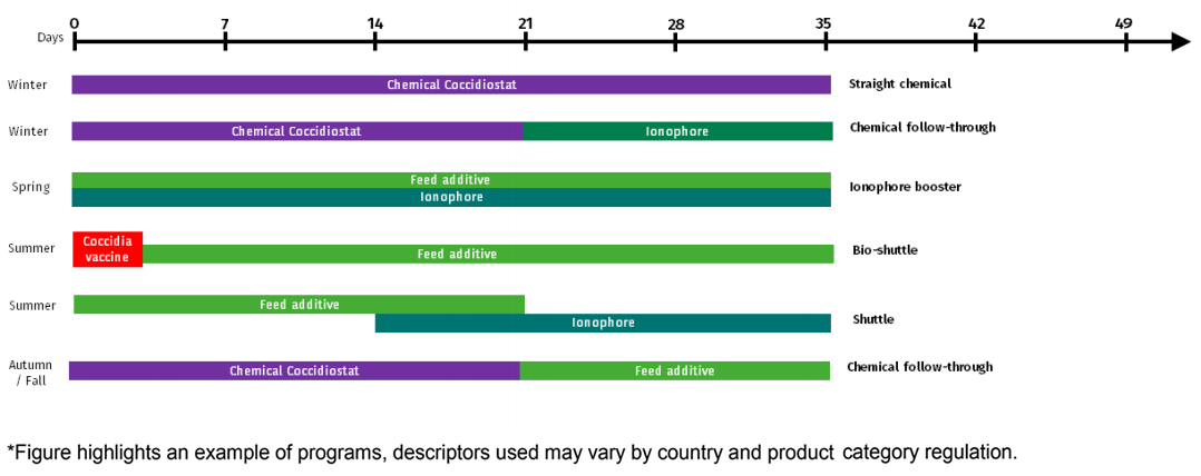 Chemical anticoccidials tend to induce resistance more rapidly compared with ionophores because of their mode of action during the intracellular life cycle of Eimeria. However, this resistance may be masked while using chemical and ionophore blends as Eimeria that are resistant to chemical may still have susceptibility to the ionophore making the overall prophylactic use effective. However, the challenge with ionophores is that they have a very narrow range for safety, can contribute to reduced performance and may impact heat tolerance. Many producers have implemented programs that rotate anticoccidials between flocks (rotation programs) or use different anticoccidials in starter, grower and finisher rations (shuttle programs) to maintain or improve Eimeria drug sensitivity.