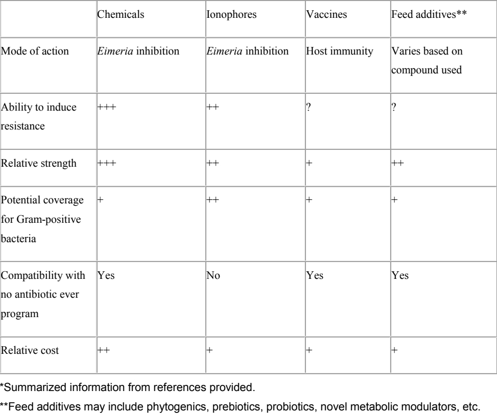 Table 1. Reflections on anticoccidial strategies used in commercial production*