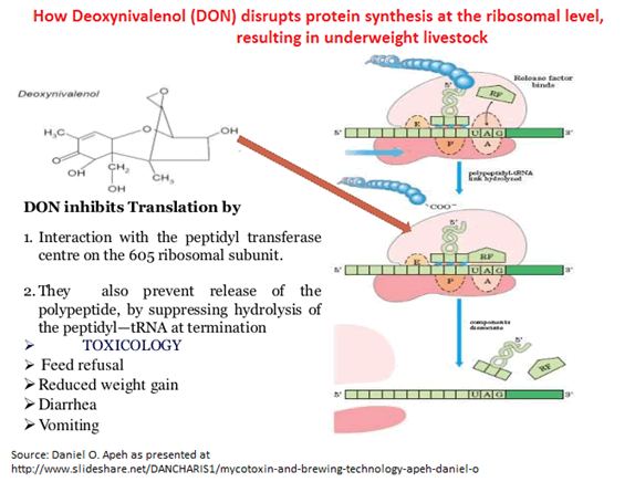 • Many mycotoxins work by wrecking the cellular structures where protein synthesis occurs • Another causation mechanism is the inflammation (immune response) they create, which can reduce growth by up to 30%