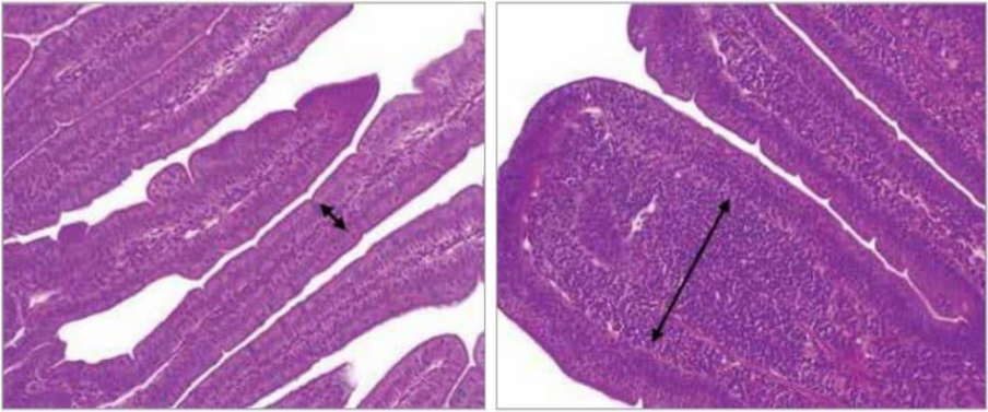 Chicken intestinal epithelium: the arrow indicates the normal thickness of the lamina propria (left). Intestinal epithelium with dysbiosis: the arrow indicates the increased thickness of the lamina propria, with infiltration of immune cells and edema (right). Belote et al., 2018.