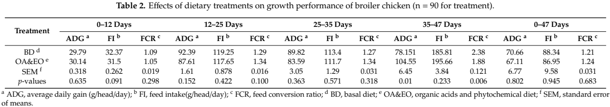 Growth performance were favorably affected by OA&EO treatment only at the final growing phase (35–47 days), showing a significant growth recover if compared to previous phases when growth rate decreased in chicks fed an OA&EO diet compared to those fed a basal diet. Probably, a delay in the adaptation to the supplement by OA&EO group that improved later growth performance could justify this finding. Gheisar et al. [28], using different level of supplementation of the same additives, found a linearly increase in body weight gain from day 0 to day 21, while no effect was shown from day 21 up to 35 days as a result of the increase of level of supplementation. Overall, in our trial the dietary supplement at the level of 0.5% (on as-fed basis) did not substantially change the average growth performance, thus confirming that doses, dietary interaction with other ingredients, could have a clear effect on animal performance. It is also possible that overall good environmental conditions with well-nourished chickens and good disinfection practices did not drive to a clear growth improvement in chickens treated with an OA&EO supplement compared to BD ones during the growing period.
