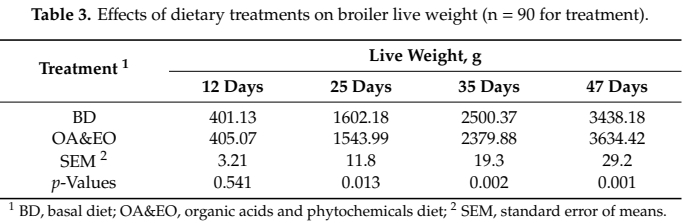 No significant difference in live weight between treatments was found at day 12, while at 25 d and at 35 d, the OA&EO group showed a lower (p < 0.05) live weight compared to BD. On the other hand, the final weight at 47 d was significantly higher (p = 0.001) in the OA&EO group than in the BD one. As a consequence, in the 35–47 d growing phase average daily gain was significantly higher in the OA&EO group (104.5 vs. 78.1 g/d, respectively in OA&EO vs. BD broilers), whereas at 0–12 days, 12–25 days and 25–35 days, no significant differences were found in the growth rate between treatments. Feed intake tended to be lower (p < 0.10) at 0–12 days in the OA&EO group compared to its counterpart, while no differences were reported in the subsequent growing phases. Feed conversion ratio improved significantly (p < 0.01) in the last growing phase (35–47 days) in the OA&EO group compared to BD according to the differences in the average daily gain previously reported.