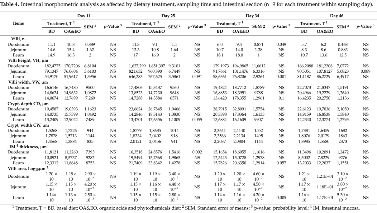 Three cm length-portions of each segment were collected during the trial at 11, 25, 34 and 46-day. A total of 216 samples were analyzed for morphometric analysis due to different treatments (BD and OA&EO) and age of chicks. Individual segments of intestine were rinsed with 0.9% of physiological saline and then fixed in 4% buffered paraformaldehyde. The fixed samples were dehydrated, cleared and infiltrated with paraffin in a tissue processor, Leica ASP300, and then embedded in paraffin blocks. The blocks were sectioned in slices of 2.5 µm of thickness, with two slices for every block. The sections were placed on glass slide and stained with hematoxylin and eosin (HE) with an automatic Stainer (Thermo Scientific Shandon varistain gemini) for histological analysis. Morphometric analysis was performed through a Leica DMLB microscope connected with a Nikon camera. Villus height, villus width, crypt depth and crypt width were individually measured on at least five intact villi per intestinal segment. In addition, intestinal mucosa thickness was measured, and villus surface area was calculated using the equation of Rubio et al. [32]: Villus surface area [µm2 ]= π × Villus height [µm] × Villus width [µm] and expressed in Log10 basis. The criterion for villus selection was based on the presence of intact lamina propria. Villus height was measured from the tip of the villus to the villus-crypt junction, whereas crypt depth was defined as the depth of the invagination between adjacent villi.