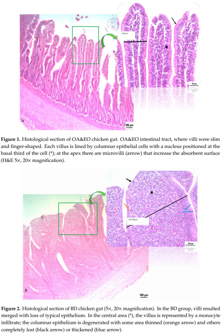 Morphometric parameters of villi (height, width and surface area) and depth and width of crypts in three segments of the small intestine (duodenum, jejunum and ileum) are reported in Table 4. On day 11, dietary treatment did not affect the morphometric parameters. On day 24 in the ileum tract, significant differences were observed, with villi height (p = 0.091) and crypt depth (p = 0.055) being higher in the OA&EO group compared to the BD one. Moreover, at the same sampling time, mucosa thickness of duodenum was significantly higher (p = 0.002) in OA&EO chicks compared to its counterpart. At day 34 in the ileal tract, OA&EO chicks showed an increased villi height (p = 0.001), an increased in tendency (p = 0.10) villi width, higher mucosa thickness (p = 0.057) and villi area, Log10 (p = 0.005), compared to BD chicks. At duodenum level, at the same sampling time, the number of villi was higher (p < 0.05) in the OA&EO treatment than in BD one. At day 46 in jejunum, villi height tended to be higher (p = 0.089) in OA&EO chicks compared to BD ones. Moreover, the epithelial structure of chicks’ gut fed with OA&EO and BD was different in terms of cells organization and inflammation as shown in Figures 1 and 2. In the OA&EO group, villi appear slim, finger-shaped, separated from each other and lined by columnar epithelial cells with a nucleus positioned at the basal third of the cell and visible crypts. They also have a dense network of blood capillaries, lymphatic capillary and connective tissue at the base. In the BD group, intestinal villi resulted merged with neighboring villi, with marked monocyte infiltrate in the central area. Crypts are non-distinguishable.