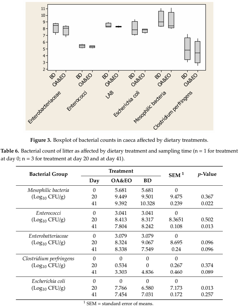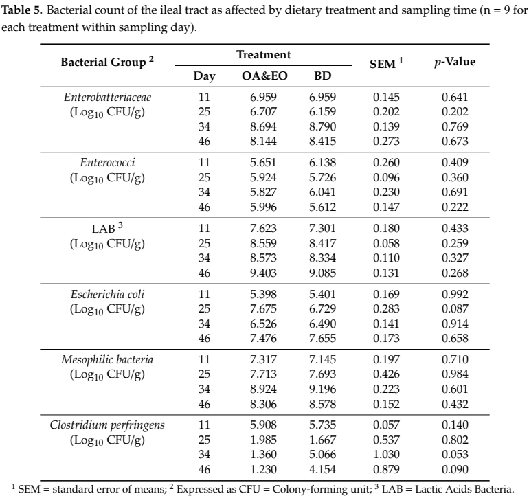 The presence of Escherichia coli was not affected by dietary treatment, with an exception at day 25, when there was higher amount of E. coli in OA&EO chickens compared to BD ones. It is well known that the antimicrobial activity of essential oils such as thymol, eugenol and carvacrol, which showed high antimicrobial activity against pathogenic bacteria such as Escherichia coli and Salmonella typhimurium, is a potential risk factor of enteric infections [10]. Nevertheless, a blend of organic acids and essential oils may positively affect the presence of Lactobacillus but not always cause a reduction of E. coli in fecal matter [28]. Mesophilic bacteria count showed the same increasing trend across the sampling time with no differences between treatments.