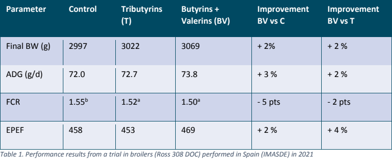 In a trial performed in Spain (IMASDE) using 792 male broiler chickens (Ross 308 DOC, 12 replicate pens per treatment and 22 birds per pen) the effects of a product combining valeric acid and butyric acid in esterified form (Gastrivix™ Avi) were compared to using sole tributyrins and a control group without any feed additive used. Gastrivix™ Avi significantly improved final body weight, average daily gain (ADG) and feed conversion ratio (FCR) compared to the control group by 7.1%, 7.4% and 8 pts, respectively. Gastrivix™ Avi numerically improved final body weight and ADG, and statistically improved FCR by 3.8%, 3.9% and 6 pts compared to the tributyrins only group (Table 1). Both numerical and statistical improvements were reported for the Gastrivix™ Avi group compared to both the control group and the tributyrins group in each single feeding phase.