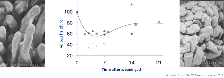 Weaning piglets from the sow is one of the most stressful events in the pig's life and can contribute to intestinal and immune system dysfunctions, compromising pig health and resulting in reduced growth and feed intake, particularly in the first week after weaning. Piglets are usually weaned at a time when the passive immunity is declining, and acquiring active immunity is a slow process and it might not be fully functional until about 8 weeks of age (Bailey et al., 2005). The magnitude and severity of this weaning crisis at the level of the gut mucosa depends on how much the immune system developed during the pre-weaning period. During the first 4 to 5 days post weaning, villus height is approximately 40 to 75% less than pre-weaning, reducing the weaned piglet's ability to absorb nutrients, and therefore also reducing body weight gain (Masri et al., 2015). As shown in Figure 1, weaning shortens the intestinal villi, and compromises the intestine's integrity and barrier function.