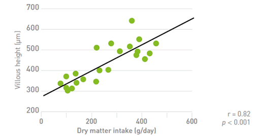 The voluntary feed restriction (anorexia) that occurs at weaning is thought to be the main cause of villous atrophy during this stage. Almost half of piglets (45%) do not eat any feed in the first 24 hours post weaning, and another 5-10% of them remain without feed for about 48 hours (Van Kempen, 2014). Pluske et al. (1997) demonstrated the strong correlation between post-weaning anorexia and villous atrophy, and found that piglets that ate better had significantly longer villi (Figure 2).
