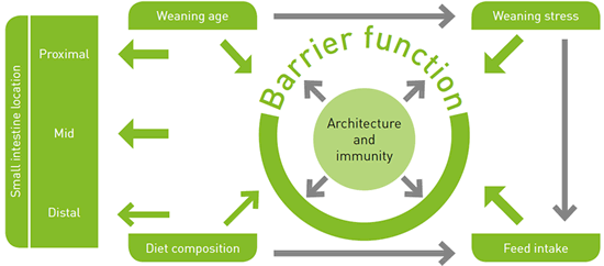 Damages to the intestine increase its permeability to macromolecules (known as 'leaky gut'), including lipopolysaccharides (LPS), toxins, and pathogens such as E.coli and Salmonella that cause local and systemic inflammation and severe post-weaning diarrhea (Pie et al., 2004). Leaky gut can also lead to a severe electrolyte imbalance, which is another cause of diarrhea at this stage, resulting in a post-weaning growth lag (Pluske et al., 1997; Boudry et al., 2004; Montagne et al., 2004). In summary, the main factors affecting piglet gut barrier function during weaning are: weaning stress (including age at weaning), feed intake and diet composition (Figure 3: Wijtten et al., 2011).