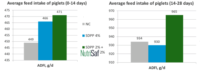 The functional protein source Nutrisaf® is obtained from a primary culture of a proprietary strain and can be used as Nutrisaf® is proven to enhance gut health and the performance of weaned piglets in the nursery stage. Figure 4 shows that supplementing the nursery diet with Nutrisaf® for 28 days after weaning was as effective as SDPP in corn-Soybean meal based diet, and significantly increased the feed intake during the 2 first weeks after weaning as well as during following period of post weaning (14-28 days).